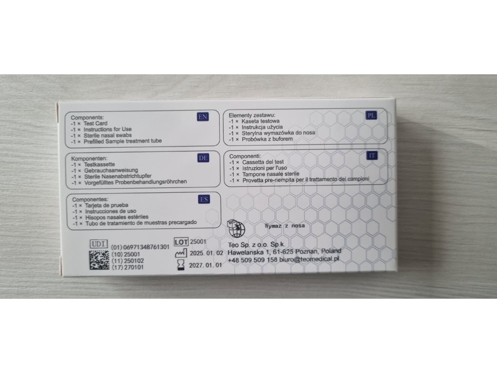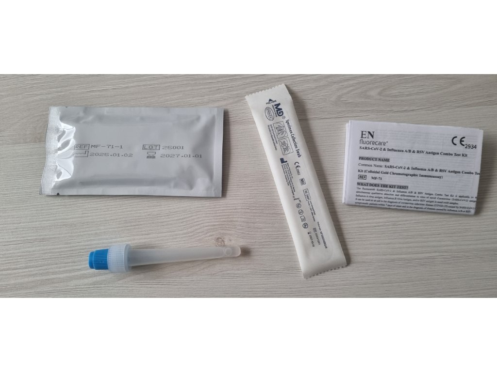 Obsah balení: 1x testovací kazeta na COVID-19 + FLU A/B + RSV, 1x výtěrový tampon, 1x extrakční pufr (buffer), 1x extrakční zkumavka, 1x příbalový leták v českém jazyce.